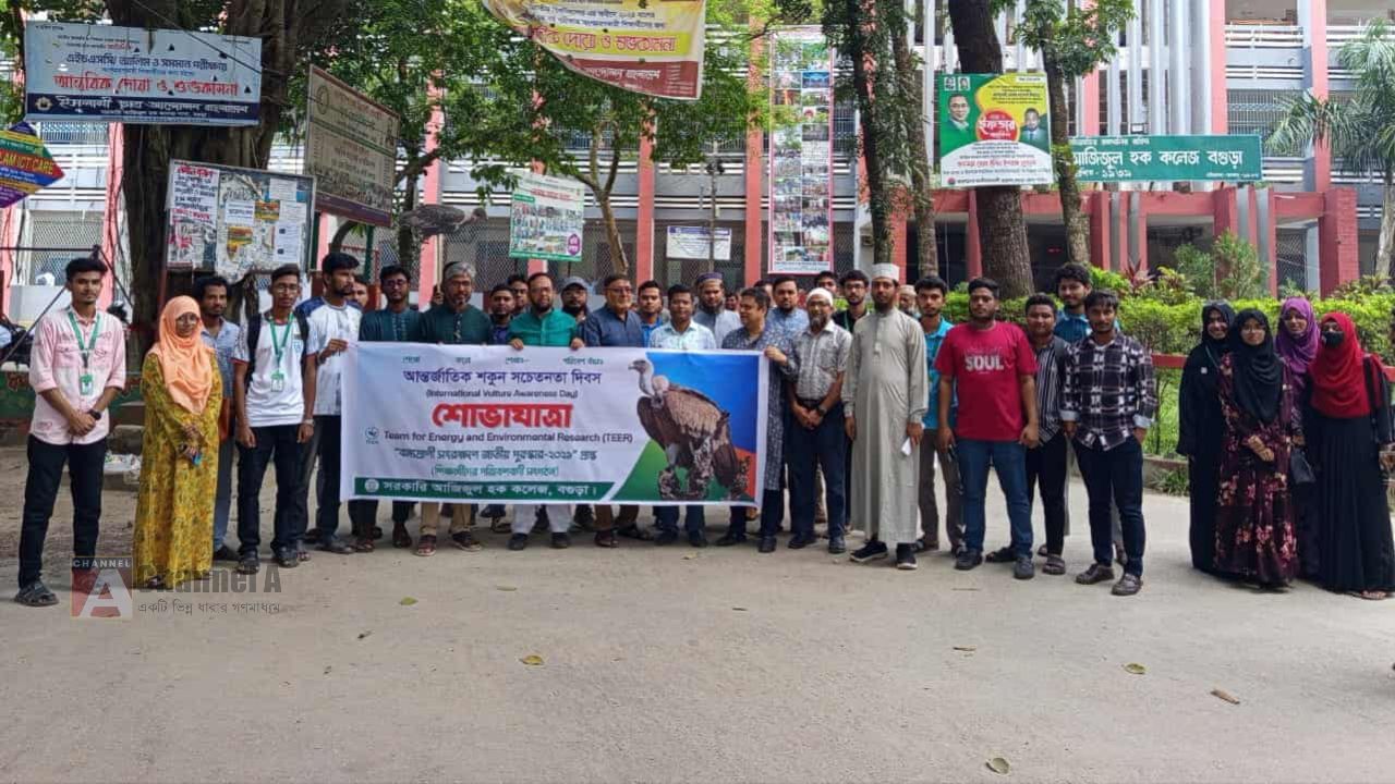 বগুড়া সরকারি আজিজুল হক কলেজে শিক্ষার্থীদের পরিবেশবাদী সংগঠন তীর-এর উদ্যোগে আজ পালিত হলো আন্তর্জাতিক শকুন সচেতনতা দিবস। দিবসটি উপলক্ষে কলেজ প্রাঙ্গণে আলোচনা সভা ও সচেতনতামূলক কর্মসূচির আয়োজন করা হয়।