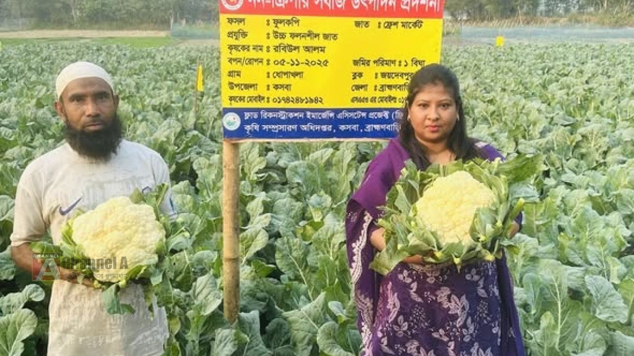 ব্রাহ্মণবাড়িয়ার কসবা উপজেলায় ‘ফ্লাড রিকনস্ট্রাকশন ইমার্জেন্সি এ্সিসটেন্স প্রজেক্ট (ফ্রিপ) এর আওতায় নন ক্রিপার সবজি উৎপাদন প্রদর্শনীর ফুলকপি চাষ করে অভাবনীয় সাফল্য অর্জন করেছেন কৃষক রবিউল আলম রব্বানী। উপজেলা কৃষি অফিসের সহযোগিতায় তার জমিতে উৎপাদিত প্রতিটি ফুলকপির ওজন হয়েছে প্রায় ৩ থেকে ৫ কেজি। গত সোমবার (১৯ জানুয়ারি, ২০২৬) তিনি তার এই বিশাল আকৃতির ফুলকপির প্রথম সংগ্রহ শুরু করেছেন।